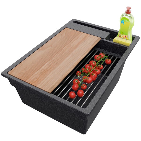 PRIMAGRAN Spülbecken Anthrazit 38x53cm, Granitspüle 1 Becken + Ablauf-Set + Küchenzubehörset, Küchenspüle ab 40er Unterschrank - Oslo Pocket