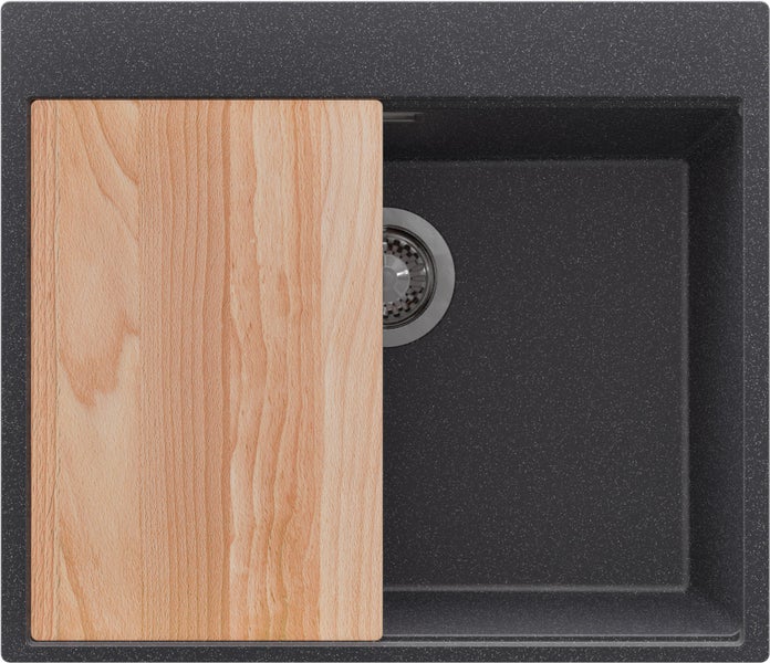 PRIMAGRAN Spülbecken Anthrazit 58x50cm, Granitspüle 1 Becken + Ablauf-Set + Schneidebrett, Küchenspüle ab 60er Unterschrank - Oslo