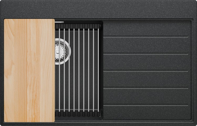 Die Möglichkeit, Zubehör über die gesamte Breite des Spülbeckens zu verschieben – auch über die Abtropffläche – ist eine enorme Erleichterung beim täglichen Kochen. Erstellen Sie Ihre eigene Arbeitszone mit einem speziellen Schneidebrett auf Top-Niveau und Abtropfflächen auf Level-Niveau und sparen Sie Platz auf der Arbeitsplatte.