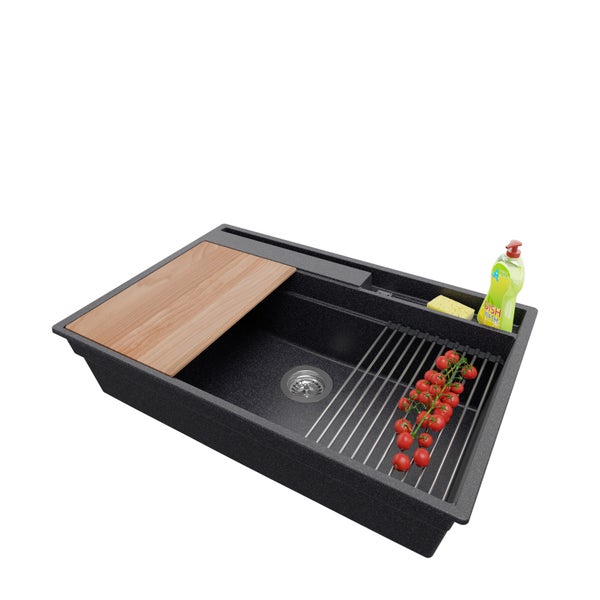 PRIMAGRAN Spülbecken Anthrazit 78x53cm, Granitspüle 1 Becken + Ablauf-Set + Küchenzubehörset, Küchenspüle ab 80er Unterschrank - Oslo Pocket