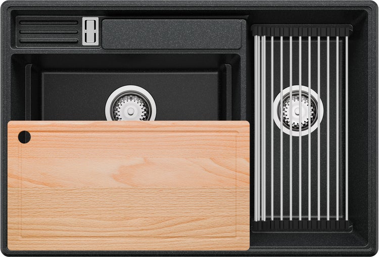 STORE - In dem kleineren Becken können Sie alle benötigten Zubehör oder Geschirr verstauen, die Sie dank eines perfekt mit den Rändern der Spüle bündigen Brettes verbergen können. Das Brett verfügt über eine Vertiefung, die das Auslaufen von Flüssigkeiten verhindert und diese durch eine Öffnung in das Spülbecken ableitet. Zudem dient die Öffnung als praktischer Griff und gewährleistet die Belüftung in dem kleineren Becken. Darüber hinaus bietet der eingebaute Organizer Platz zum Ablegen von Zubehör wie Schwamm und Spülmittel sowie einen Platz zum Ablegen des Brettes zum Trocknen.