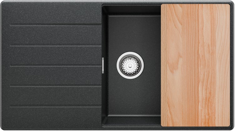 PRIMAGRAN Spülbecken Anthrazit 90x50cm, Granitspüle 1 Becken + Ablauf-Set + Schneidebrett, Küchenspüle ab 60er Unterschrank - Kopenhagen