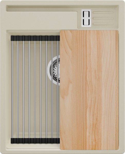 PRIMAGRAN Spülbecken Beige 43x53cm, Granitspüle 1 Becken + Ablauf-Set + Küchenzubehörset, Küchenspüle ab 45er Unterschrank - Oslo Pocket