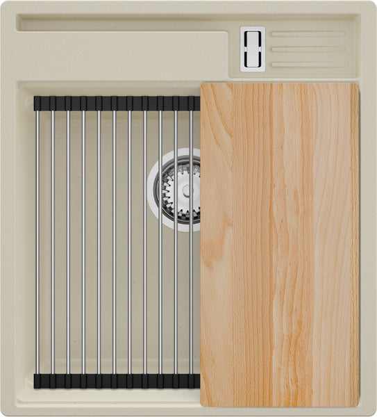PRIMAGRAN Spülbecken Beige 48x53cm, Granitspüle 1 Becken + Ablauf-Set + Küchenzubehörset, Küchenspüle ab 50er Unterschrank - Oslo Pocket