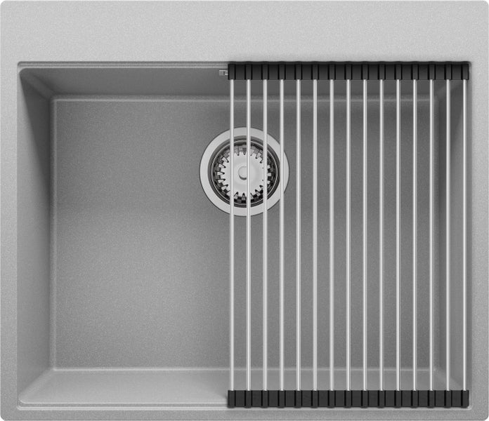 PRIMAGRAN Spülbecken Grau 58x50cm, Granitspüle 1 Becken + Ablauf-Set + Aufrollbare Abtropffläche, Küchenspüle ab 60er Unterschrank - Oslo