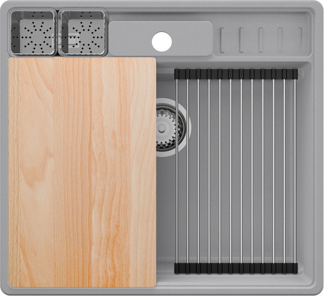 PRIMAGRAN Spülbecken Grau 58x53cm, Granitspüle 1 Becken + Ablauf-Set + Küchenzubehörset, Küchenspüle ab 60er Unterschrank - New York