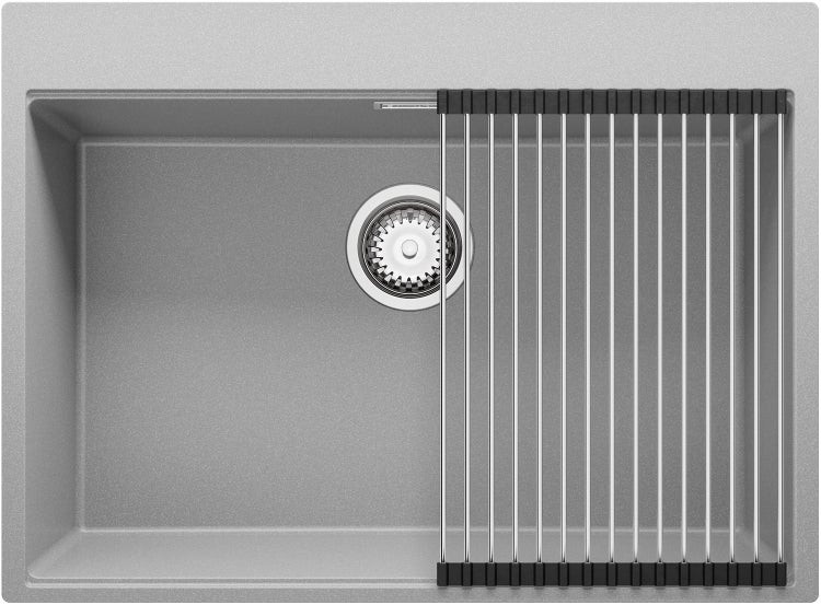 PRIMAGRAN Spülbecken Grau 68x50cm, Granitspüle 1 Becken + Ablauf-Set + Aufrollbare Abtropffläche, Küchenspüle ab 70er Unterschrank - Oslo