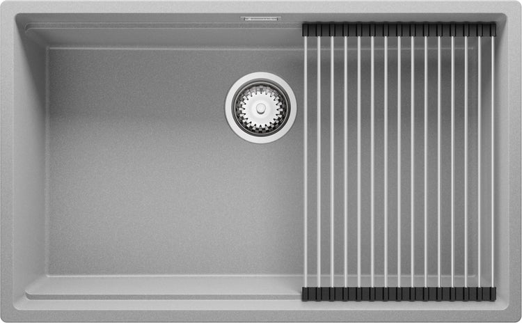 PRIMAGRAN Spülbecken Grau 76x47cm, Granitspüle 1 Becken + Ablauf-Set + Aufrollbare Abtropffläche, Küchenspüle ab 80er Unterschrank - Praga Slim