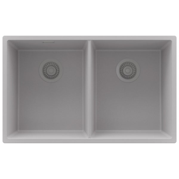 PRIMAGRAN Spülbecken Grau 76x47cm, Granitspüle 2 Becken + Ablauf-Set, Küchenspüle ab 80er Unterschrank - London Slim Twin