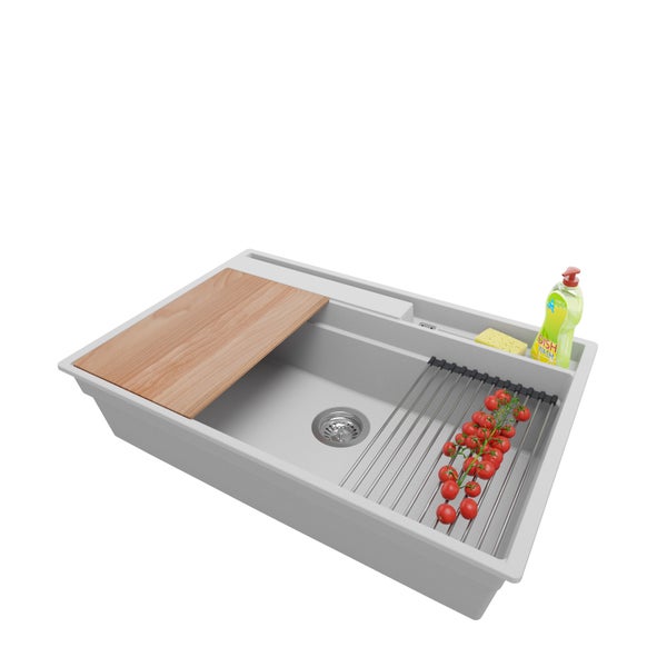 🔨 Im set 🔨Spüle Oslo 80 Pocket Multilevel (Right), komplettes Abflusssystem (hochwertiger Siphon, Überlauf, zusätzlicher Abfluss für den Anschluss an Waschmaschine oder Geschirrspüler), Aufrollbare Abtropffläche, Schneidebrett.