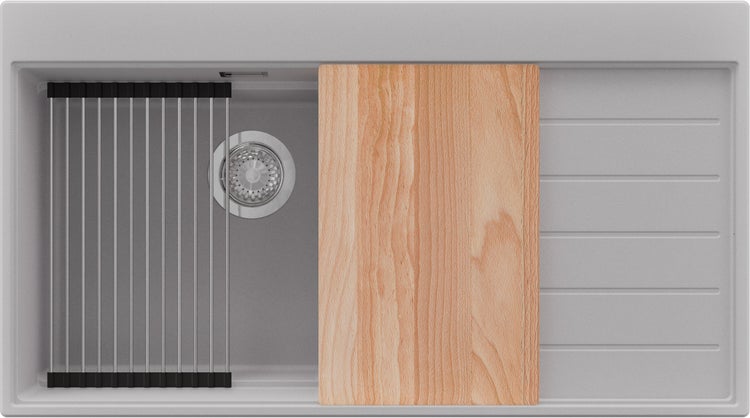 Sydney 900-60 Ergo Multilevel (Right), komplettes Abflusssystem (hochwertiger Siphon, Überlauf, zusätzlicher Abfluss für den Anschluss an Waschmaschine oder Geschirrspüler), Schneidebrett und Aufrollbare Abtropffläche.