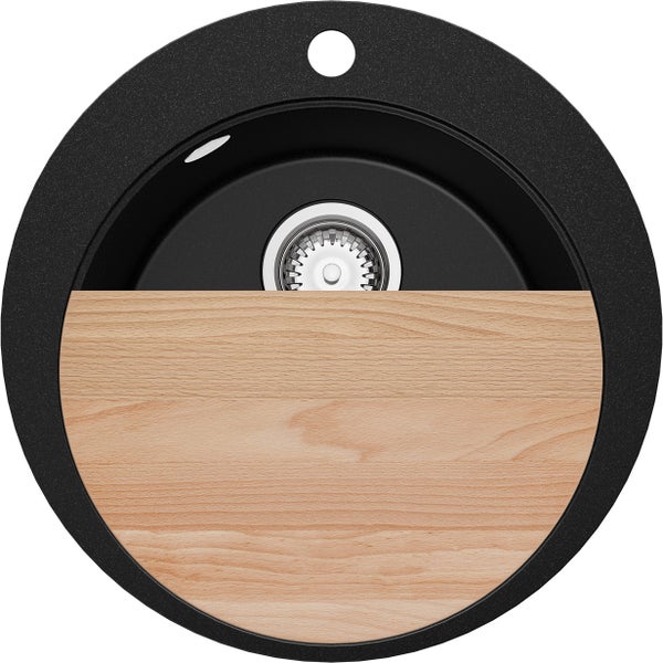 PRIMAGRAN Spülbecken Rund Schwarz 50x50cm, Granitspüle 1 Becken + Ablauf-Set + Schneidebrett, Küchenspüle ab 45er Unterschrank - Pisa