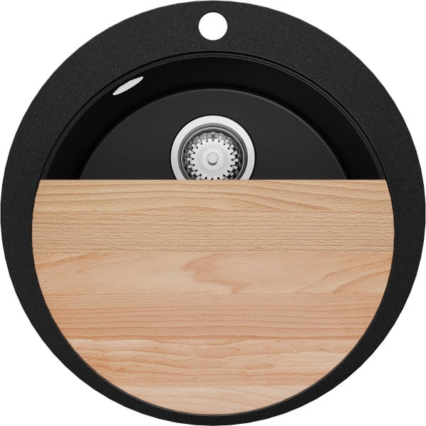 PRIMAGRAN Spülbecken Rund Schwarz 53x53cm, Granitspüle 1 Becken + Ablauf-Set + Schneidebrett, Küchenspüle ab 50er Unterschrank - Pisa Max