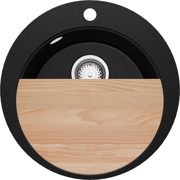 PRIMAGRAN Spülbecken Rund Schwarz Metallic 50x50cm, Granitspüle 1 Becken + Ablauf-Set + Schneidebrett, Küchenspüle ab 45er Unterschrank - Pisa