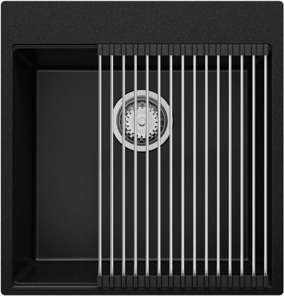 PRIMAGRAN Spülbecken Schwarz 48x50cm, Granitspüle 1 Becken + Ablauf-Set + Aufrollbare Abtropffläche, Küchenspüle ab 50er Unterschrank - Oslo