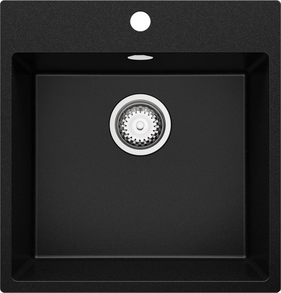 PRIMAGRAN Spülbecken Schwarz 48x50cm, Granitspüle 1 Becken + Ablauf-Set, Küchenspüle ab 50er Unterschrank - Riga
