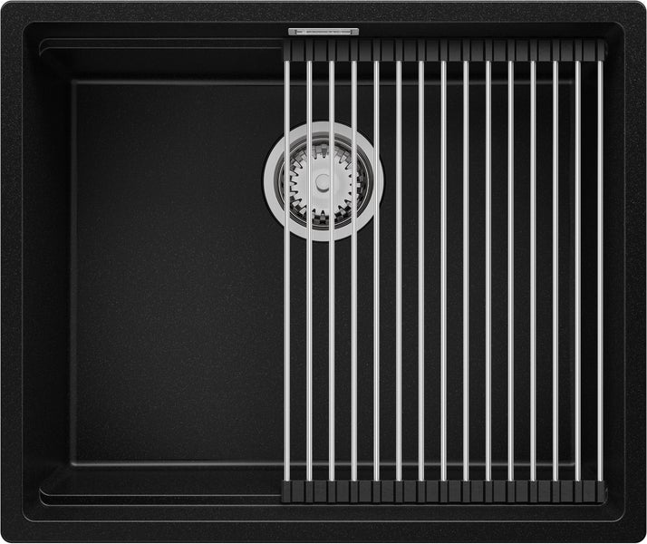 PRIMAGRAN Spülbecken Schwarz 56x47cm, Granitspüle 1 Becken + Ablauf-Set + Aufrollbare Abtropffläche, Küchenspüle ab 60er Unterschrank - Praga Slim