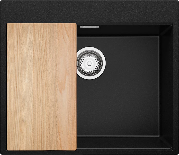 PRIMAGRAN Spülbecken Schwarz 58x50cm, Granitspüle 1 Becken + Ablauf-Set + Schneidebrett, Küchenspüle ab 60er Unterschrank - Oslo