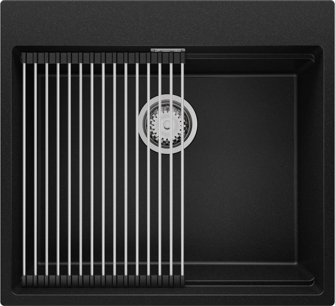 PRIMAGRAN Spülbecken Schwarz 58x53cm, Granitspüle 1 Becken + Ablauf-Set + Aufrollbare Abtropffläche, Küchenspüle ab 60er Unterschrank - Oslo Max