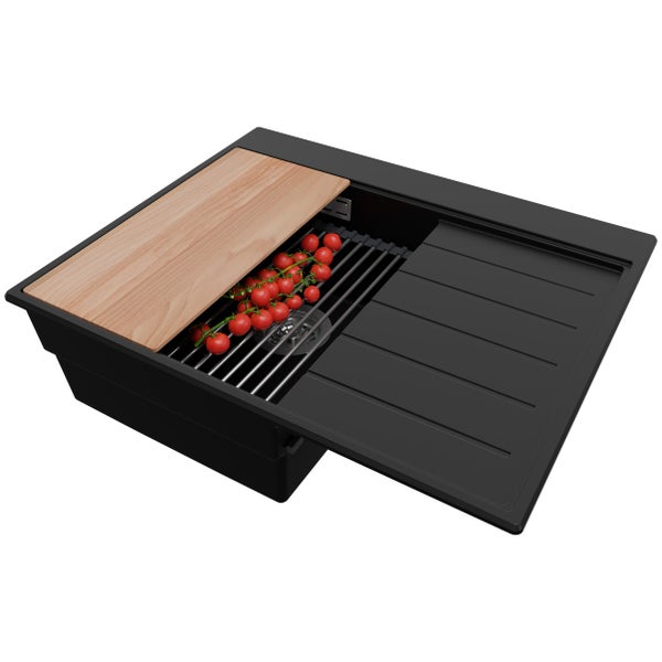 PRIMAGRAN Spülbecken Schwarz 62x50cm, Granitspüle 1 Becken + Ablauf-Set + Küchenzubehörset, Küchenspüle ab 40er Unterschrank - Sydney