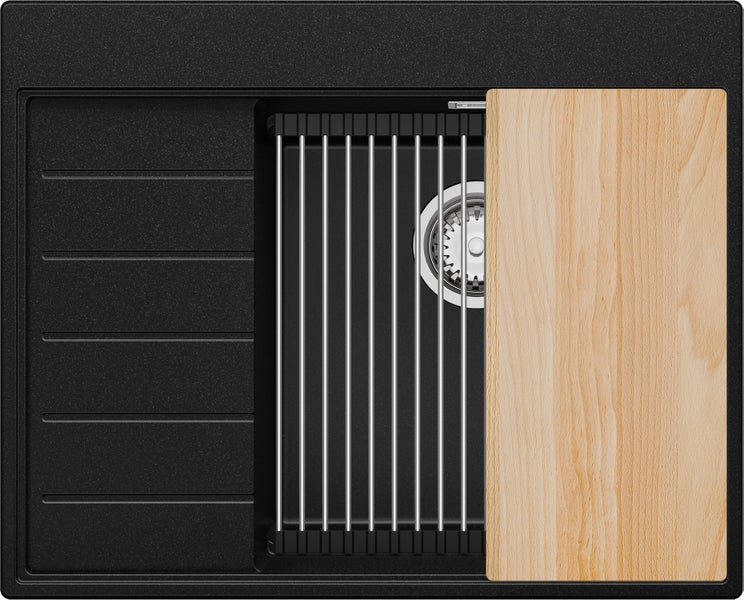 PRIMAGRAN Spülbecken Schwarz 62x50cm, Granitspüle 1 Becken + Ablauf-Set + Küchenzubehörset, Küchenspüle ab 45er Unterschrank - Sydney