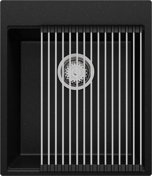 PRIMAGRAN Spülbecken Schwarz Metallic 43x50cm, Granitspüle 1 Becken + Ablauf-Set + Aufrollbare Abtropffläche, Küchenspüle ab 45er Unterschrank - Oslo