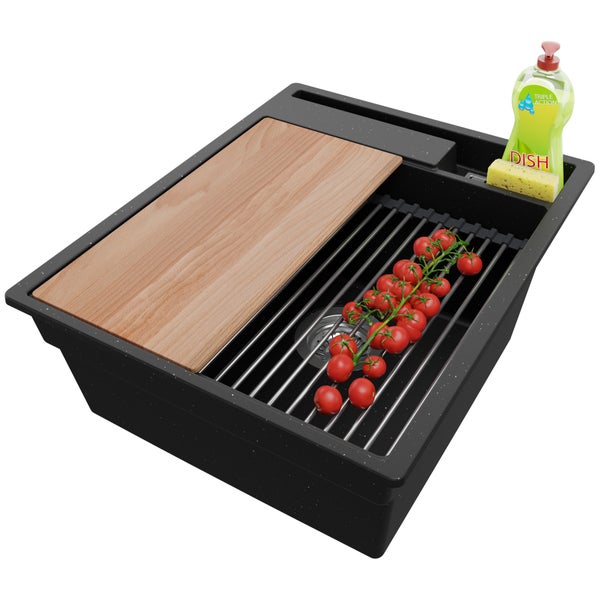 🔨 Im set 🔨Spüle Oslo 45 Pocket Multilevel (RIGHT), komplettes Abflusssystem (hochwertiger Siphon, Überlauf, zusätzlicher Abfluss für den Anschluss an Waschmaschine oder Geschirrspüler), Aufrollbare Abtropffläche, Schneidebrett.