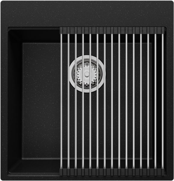 PRIMAGRAN Spülbecken Schwarz Metallic 48x50cm, Granitspüle 1 Becken + Ablauf-Set + Aufrollbare Abtropffläche, Küchenspüle ab 50er Unterschrank - Oslo
