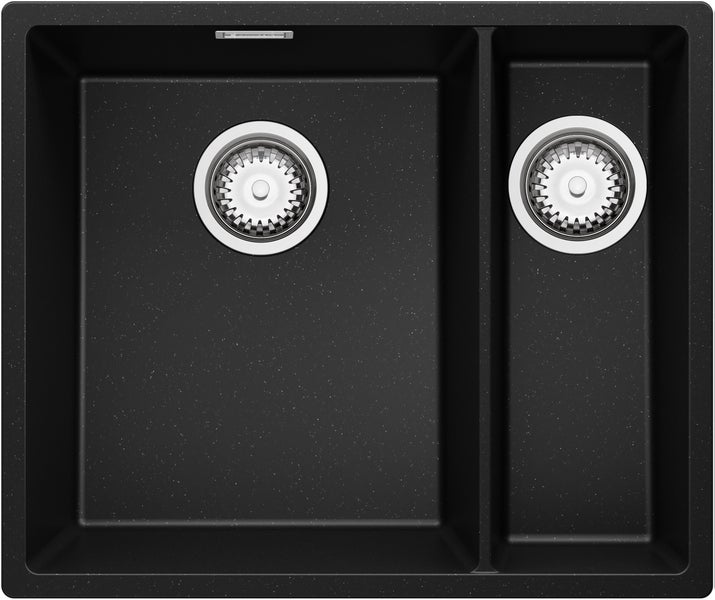 PRIMAGRAN Spülbecken Schwarz Metallic 56x47cm, Granitspüle 1,5 Becken + Ablauf-Set, Küchenspüle ab 60er Unterschrank - London Slim Duo