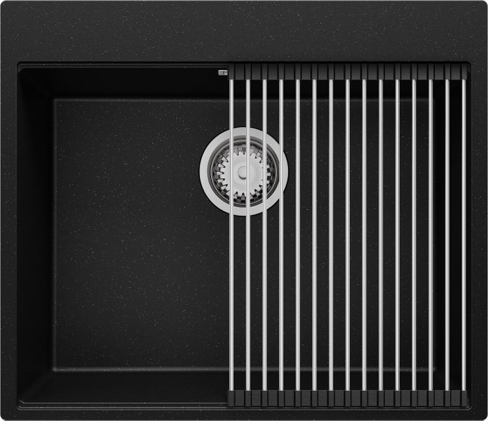 PRIMAGRAN Spülbecken Schwarz Metallic 58x50cm, Granitspüle 1 Becken + Ablauf-Set + Aufrollbare Abtropffläche, Küchenspüle ab 60er Unterschrank - Oslo