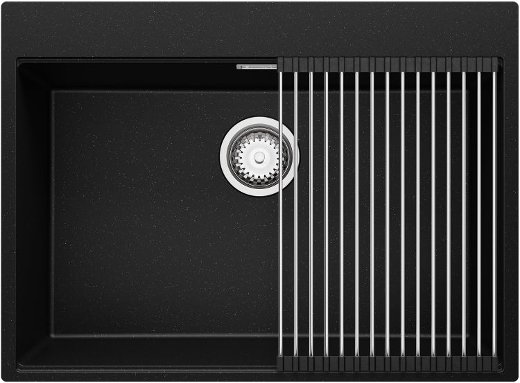 PRIMAGRAN Spülbecken Schwarz Metallic 68x50cm, Granitspüle 1 Becken + Ablauf-Set + Aufrollbare Abtropffläche, Küchenspüle ab 70er Unterschrank - Oslo