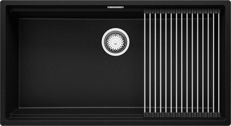 PRIMAGRAN Spülbecken Schwarz Metallic 86x47cm, Granitspüle 1 Becken + Ablauf-Set + Aufrollbare Abtropffläche, Küchenspüle ab 90er Unterschrank - Praga Slim