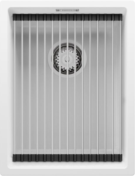 PRIMAGRAN Spülbecken Weiß 36x47cm, Granitspüle 1 Becken + Ablauf-Set + Aufrollbare Abtropffläche, Küchenspüle ab 40er Unterschrank - Praga Slim