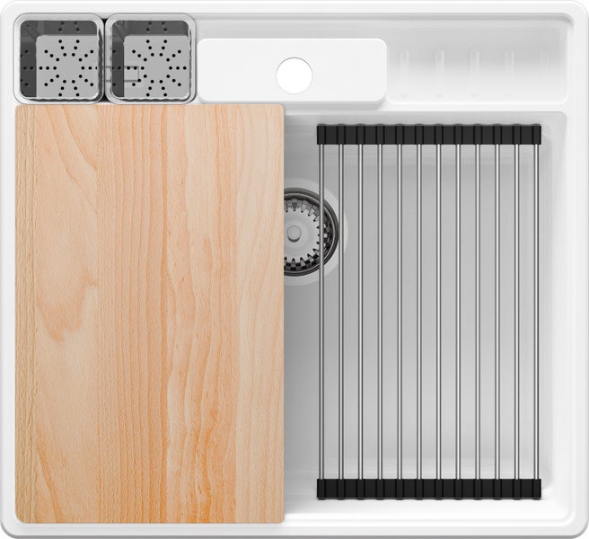 Das System ist in zwei Zonen unterteilt. Links befindet sich Platz für die im Set enthaltenen zwei Organizer und rechts Platz zum Abstellen von Spülmittel und Schwamm. In den Organisern können problemlos Besteck oder Küchenutensilien trocknen. Die speziellen Behälter eignen sich hervorragend zum Ablegen von frischen Kräutern oder anderen Zutaten. Die Organizer lassen sich leicht herausnehmen, sodass sie zum Abspülen kleinerer Früchte wie Heidelbeeren oder Trauben verwendet werden können. In den speziellen Bereich passt auch ein Schneidebrett. Passen Sie die Funktion Ihren Bedürfnissen an.
