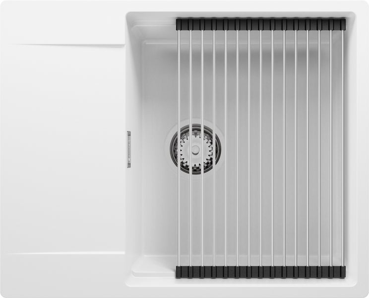 PRIMAGRAN Spülbecken Weiß 62x50cm, Granitspüle 1 Becken + Ablauf-Set + Aufrollbare Abtropffläche, Küchenspüle ab 50er Unterschrank - San Francisco