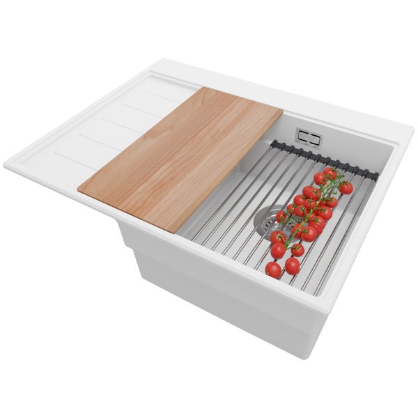 PRIMAGRAN Spülbecken Weiß 62x50cm, Granitspüle 1 Becken + Ablauf-Set + Küchenzubehörset, Küchenspüle ab 40er Unterschrank - Sydney