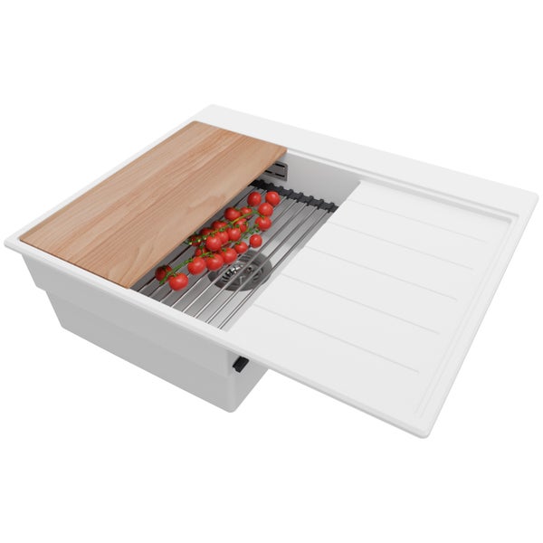 PRIMAGRAN Spülbecken Weiß 62x50cm, Granitspüle 1 Becken + Ablauf-Set + Küchenzubehörset, Küchenspüle ab 40er Unterschrank - Sydney
