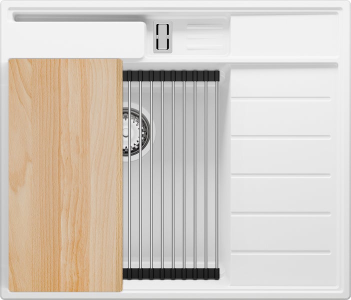 Das System Pocket Plus ist eine praktische Tasche, die eine bequeme Aufbewahrung von Schneidebrett, Schwamm und Spülmittel sowie anderen Küchenaccessoires ermöglicht. Am Boden der Tasche befindet sich ein Überlauf, sodass sich dort kein Wasser ansammelt und die darin platzierten Gegenstände schnell trocknen. Im Set mit der Spüle erhalten Sie einen rechteckigen Korb - für eine noch bequemere Ordnung im Spülbeckenbereich.