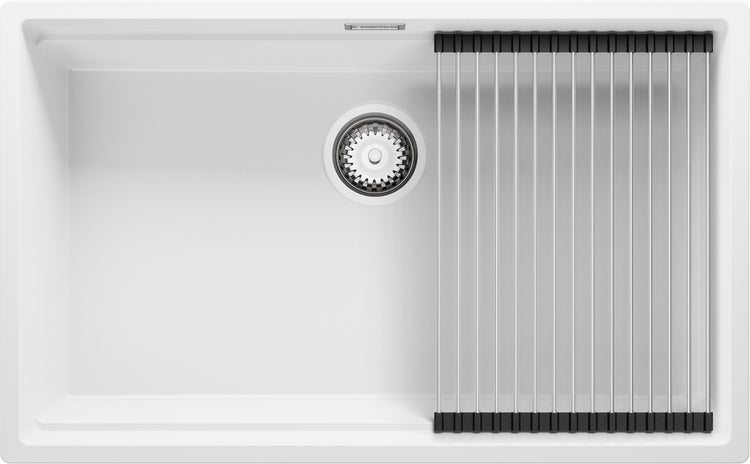 PRIMAGRAN Spülbecken Weiß 76x47cm, Granitspüle 1 Becken + Ablauf-Set + Aufrollbare Abtropffläche, Küchenspüle ab 80er Unterschrank - Praga Slim