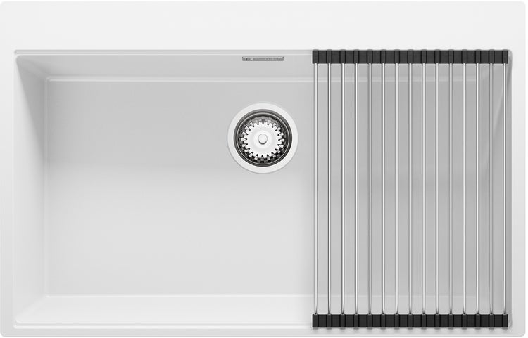 PRIMAGRAN Spülbecken Weiß 78x50cm, Granitspüle 1 Becken + Ablauf-Set + Aufrollbare Abtropffläche, Küchenspüle ab 80er Unterschrank - Oslo