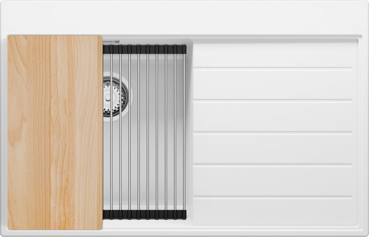 Die Möglichkeit, Zubehör über die gesamte Breite des Spülbeckens zu verschieben – auch über die Abtropffläche – ist eine enorme Erleichterung beim täglichen Kochen. Erstellen Sie Ihre eigene Arbeitszone mit einem speziellen Schneidebrett auf Top-Niveau und Abtropfflächen auf Level-Niveau und sparen Sie Platz auf der Arbeitsplatte.