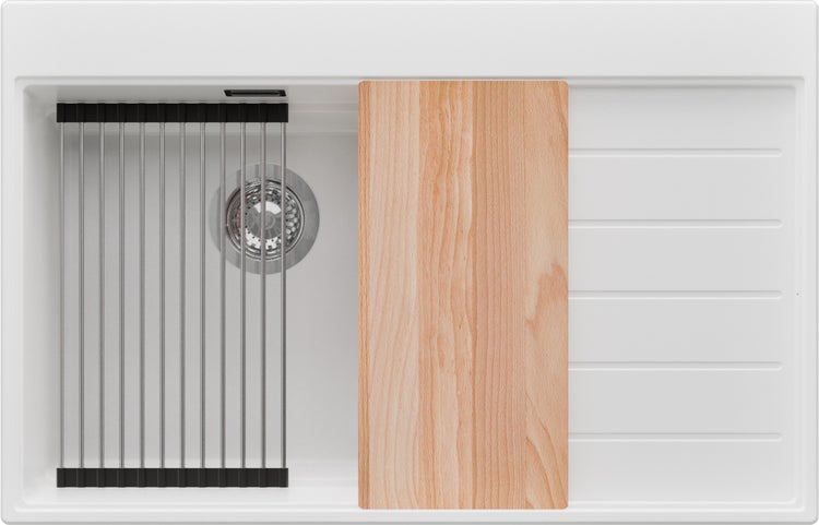 - Im Lieferumfang enthaltenAblauf und Überlaufgarnitur, Abtropfmatte, Einbauspülbecken, Schneidebrett-Einsatz aus Holz, Küchenarmatur