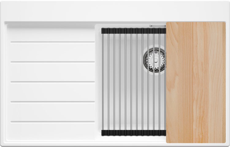 Die Möglichkeit, Zubehör über die gesamte Breite des Spülbeckens zu verschieben – auch über die Fläche der Abtropffläche – ist eine enorme Erleichterung beim täglichen Kochen. Erstellen Sie Ihre eigene Arbeitszone mit einem speziellen Schneidebrett auf Top-Niveau und Abtropfgestellen auf Level-Niveau und sparen Sie Platz auf der Arbeitsplatte.