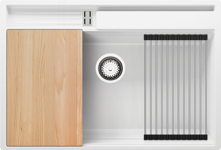 PRIMAGRAN Spülbecken Weiß 78x53cm, Granitspüle 1 Becken + Ablauf-Set + Küchenzubehörset, Küchenspüle ab 80er Unterschrank - Oslo Pocket
