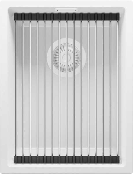 PRIMAGRAN Unterbauspüle Granit Alles Weiß 36x47cm, Spülbecken 1 Becken + Ablauf-Set + Aufrollbare Abtropffläche, Granitspüle ab 40er Unterschrank - Praga