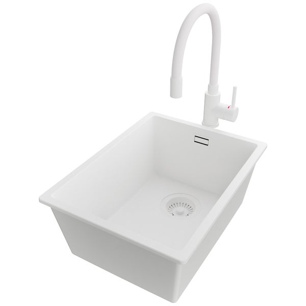 PRIMAGRAN Unterbauspüle Granit Alles Weiß 36x47cm, Spülbecken 1 Becken + Küchenarmatur 38x14cm + Ablauf-Set, Granitspüle ab 40er Unterschrank - London