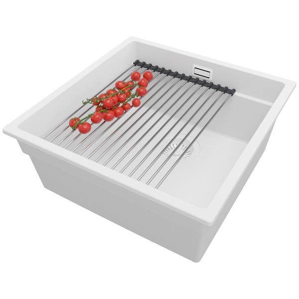 PRIMAGRAN Unterbauspüle Granit Alles Weiß 46x47cm, Spülbecken 1 Becken + Ablauf-Set + Aufrollbare Abtropffläche, Granitspüle ab 50er Unterschrank - Praga