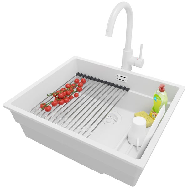 PRIMAGRAN Unterbauspüle Granit Alles Weiß 56x47cm, Spülbecken 1 Becken + Küchenarmatur 32x20cm + Ablauf-Set + Aufrollbare Abtropffläche, Granitspüle ab 60er Unterschrank - Praga