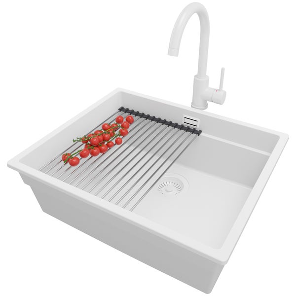 PRIMAGRAN Unterbauspüle Granit Alles Weiß 56x47cm, Spülbecken 1 Becken + Küchenarmatur 32x20cm + Ablauf-Set + Aufrollbare Abtropffläche, Granitspüle ab 60er Unterschrank - Praga