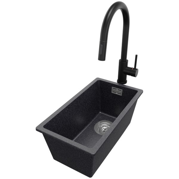 PRIMAGRAN Unterbauspüle Granit Anthrazit 26x47cm, Spülbecken 1 Becken + Küchenarmatur 40x20cm + Ablauf-Set, Granitspüle ab 30er Unterschrank - London